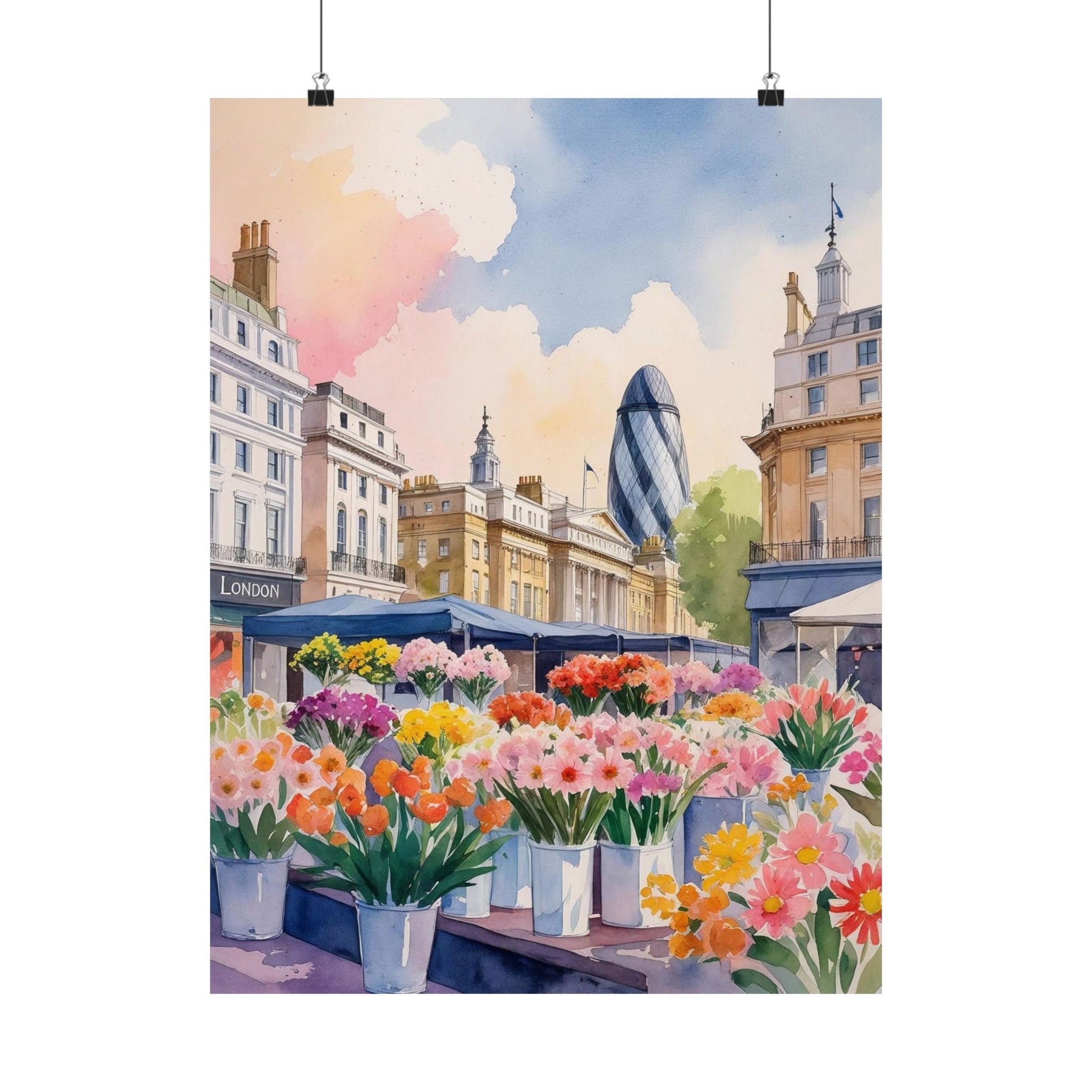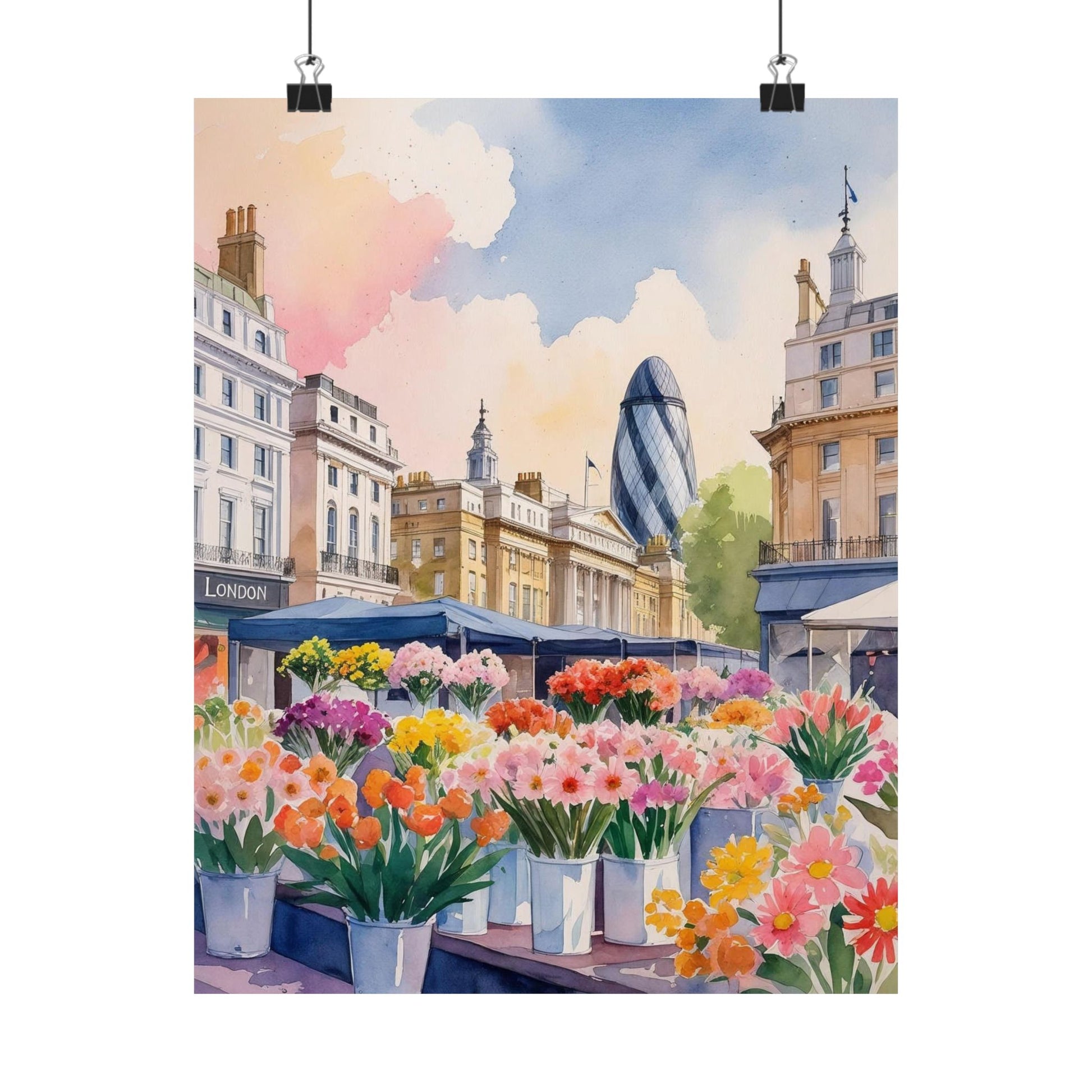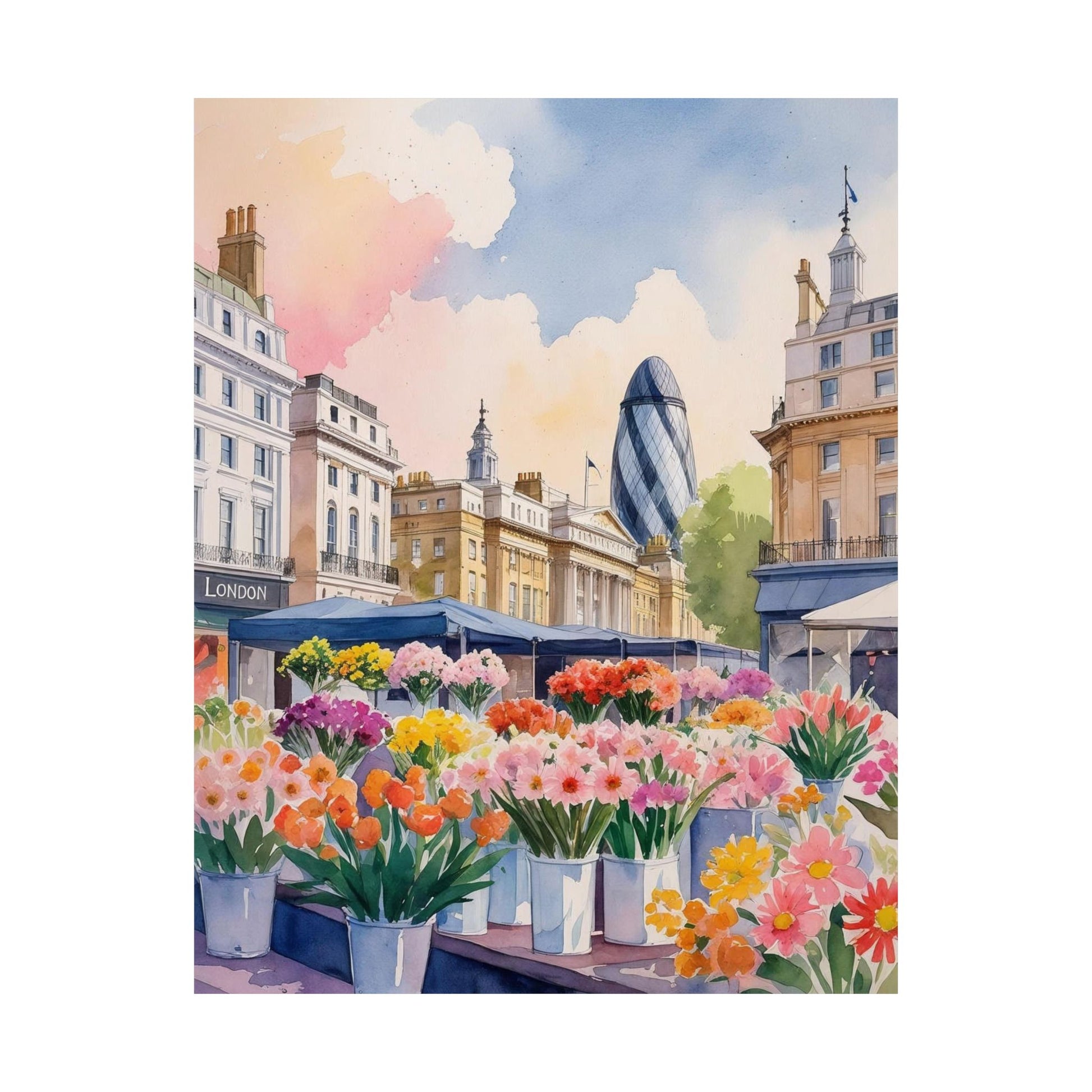 Capture the essence of a bustling London flower market with this watercolor poster. Perfect for art lovers and home decor enthusiasts, this matte poster brings a touch of nature and urban charm into any living space. Ideal for gifting during birthdays, housewarmings, or Mother's Day.